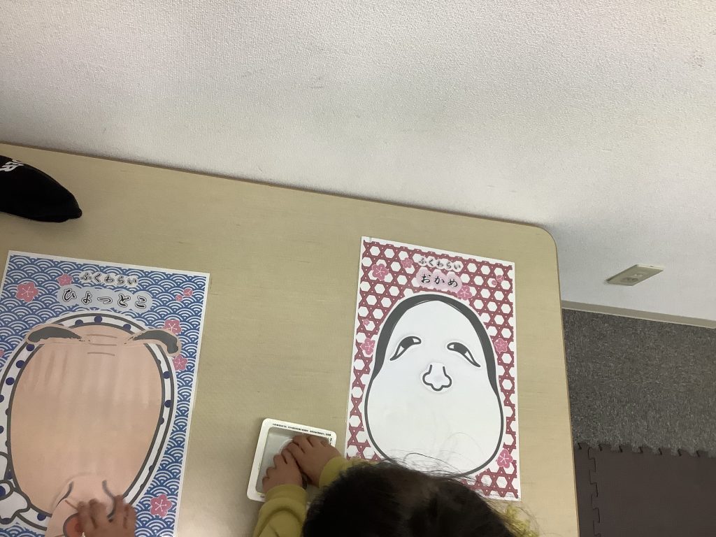 福笑い、絵合わせカルタ、羽根つき、こまや凧揚げの塗り絵などお正月のコーナーが沢山あり、お子さんたちに好きなコーナーを選んで遊んで取り組んでもらいます☺