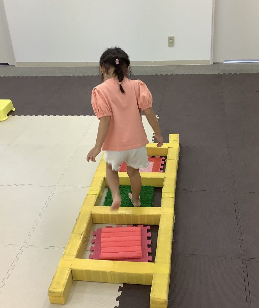 はしごの間にプチプチの梱包材、人工芝、スポンジのマットがあり、お子さんたちにはマットを踏んで進んでもらいます。