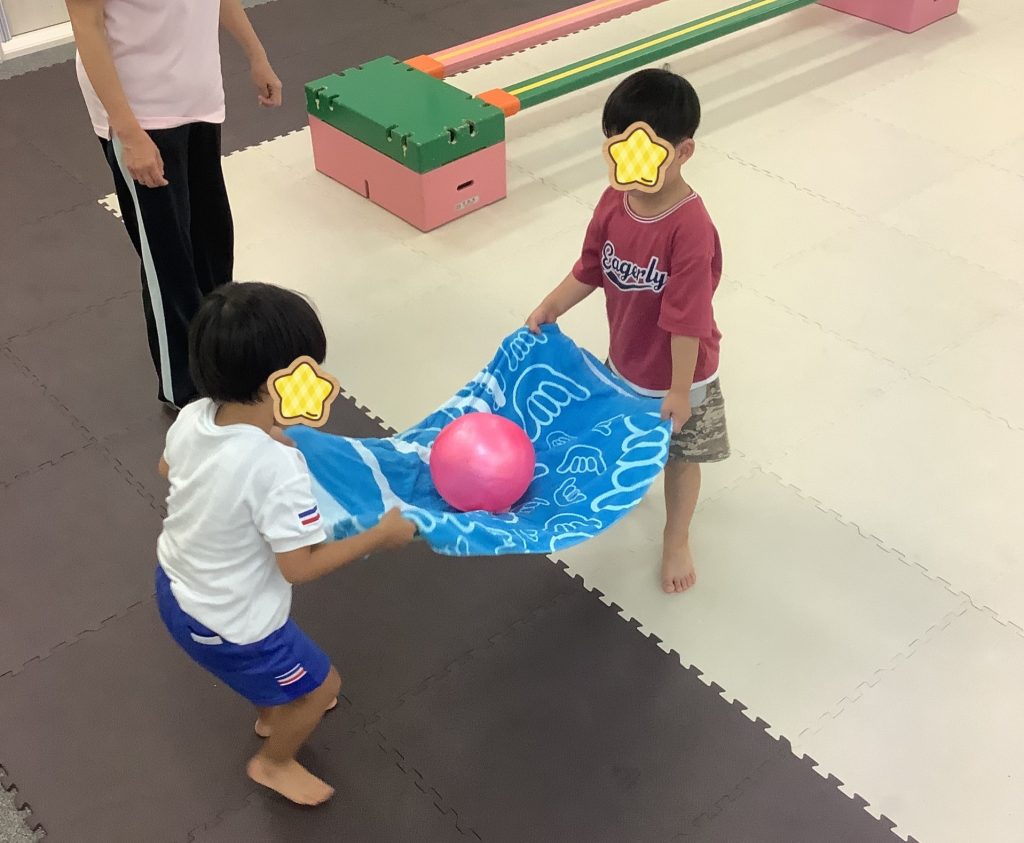タオルの上にボールを乗せてゆっくり進んだり、