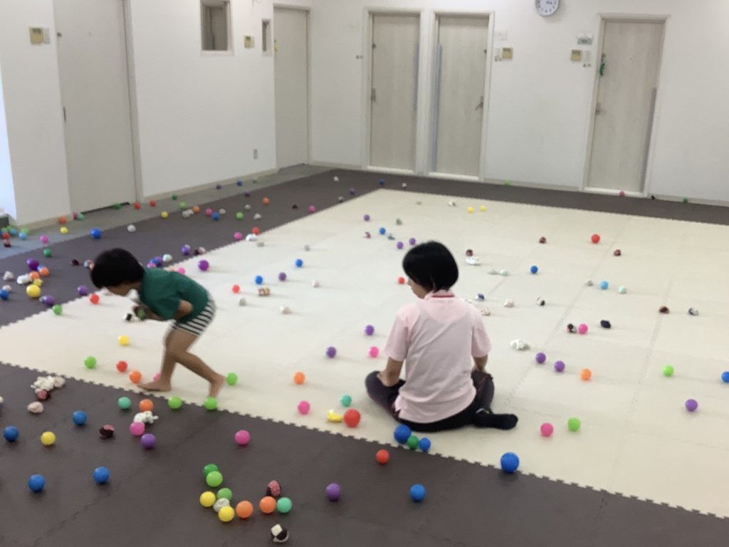 フロアに小さなボールを沢山散りばめて、ボールプールに取り組みました☺