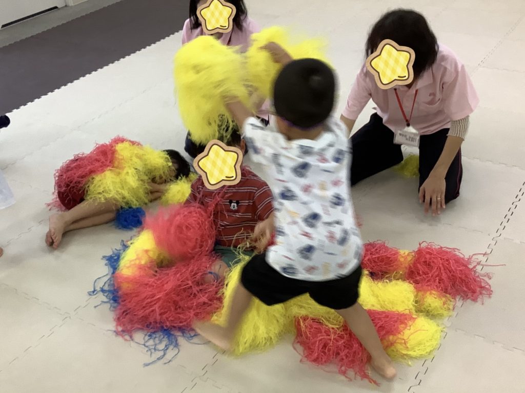 赤、青、黄のスズランテープで作ったポンポンを使って遊びました★