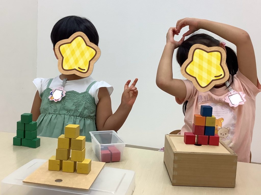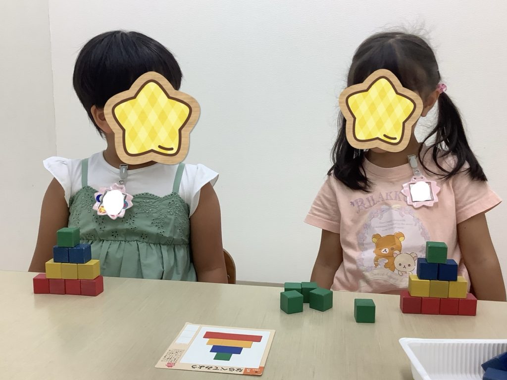 活動の中で積み木に取り組みました★スタッフが作った見本を見て、同じ形を作ってもらいます!形を捉える力や空間認知力、指先の巧緻性などが養われます☺