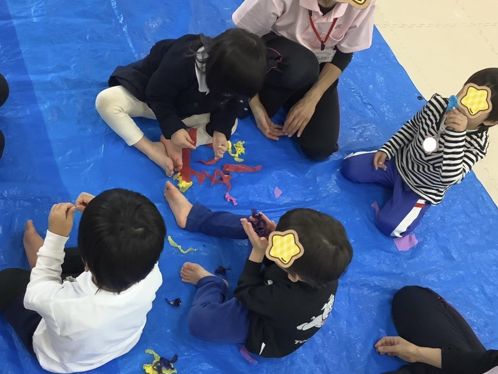 製作で使う花紙をちぎったり、丸めたりして遊びました。ちぎった花紙を上から降らせたり、埋もれたりしながら、全身に触れる感覚を楽しみながら遊んでくれていました☺カラフルな花紙で遊ぶので、色の理解を深めることにも繋がります。