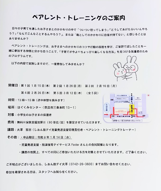 今回は同法人内のしおん放課後等デイサービス主催のペアレントトレーニング開催のお知らせです!!詳細は下記の資料又は、きんぎょ内掲示板をご確認ください(^_-)-☆