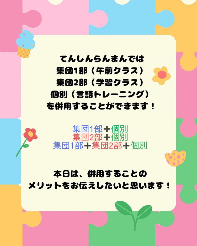 てんしんらんまんには、集団1部・集団2部(学習支援)・個別と3つのクラスがありますが、それぞれのクラスを併用していただくことをおすすめしております。