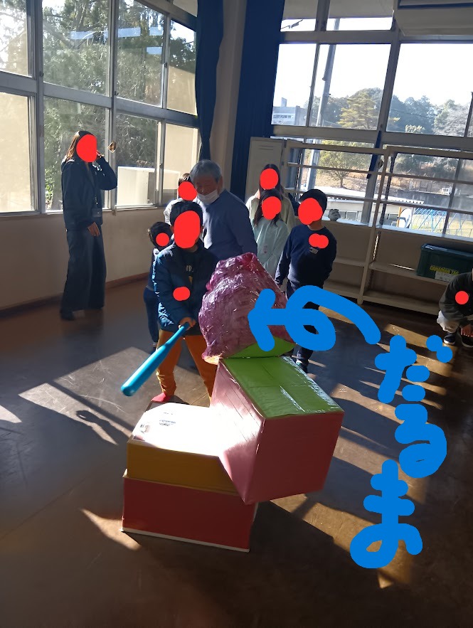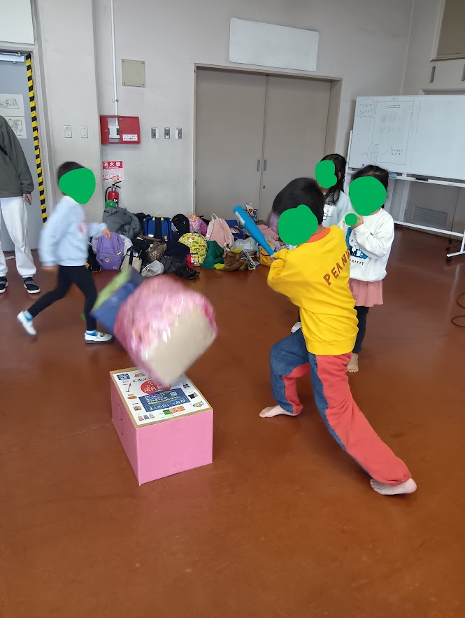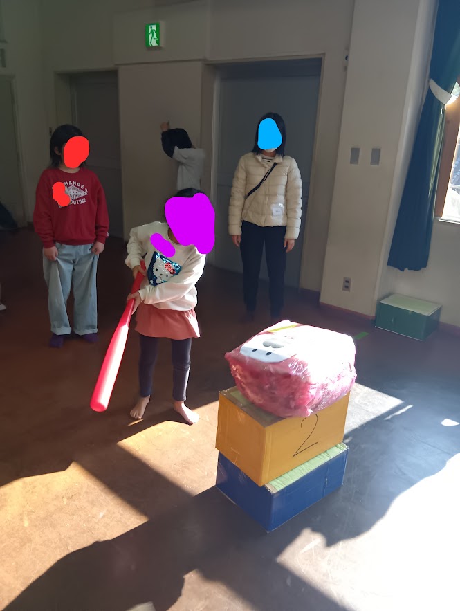 積み重ねられた段ボールに1番上に置かれただるまを倒さないよいうに、バットで下の段ボールを叩き落としていきます。さあ、うまくいくでしょうか⁈ 早速、みんな力いっぱい段ボールを叩きましたよ!
