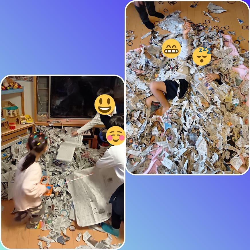 破った新聞紙を「雪」や「布団」に見立てたりと想像力を働かせて遊んだり💭