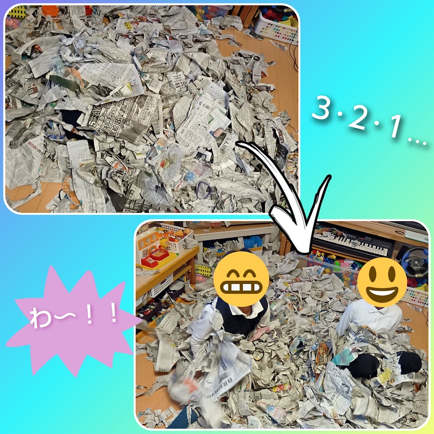 頑張ってみんなで破った大量の新聞紙に大はしゃぎで楽しく遊びました😆